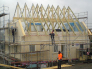 Baustelle im Winter 2009/2010 in Rheinland-Pfalz. Holzhaus mit Kniestock und Vollunterkellerung.
